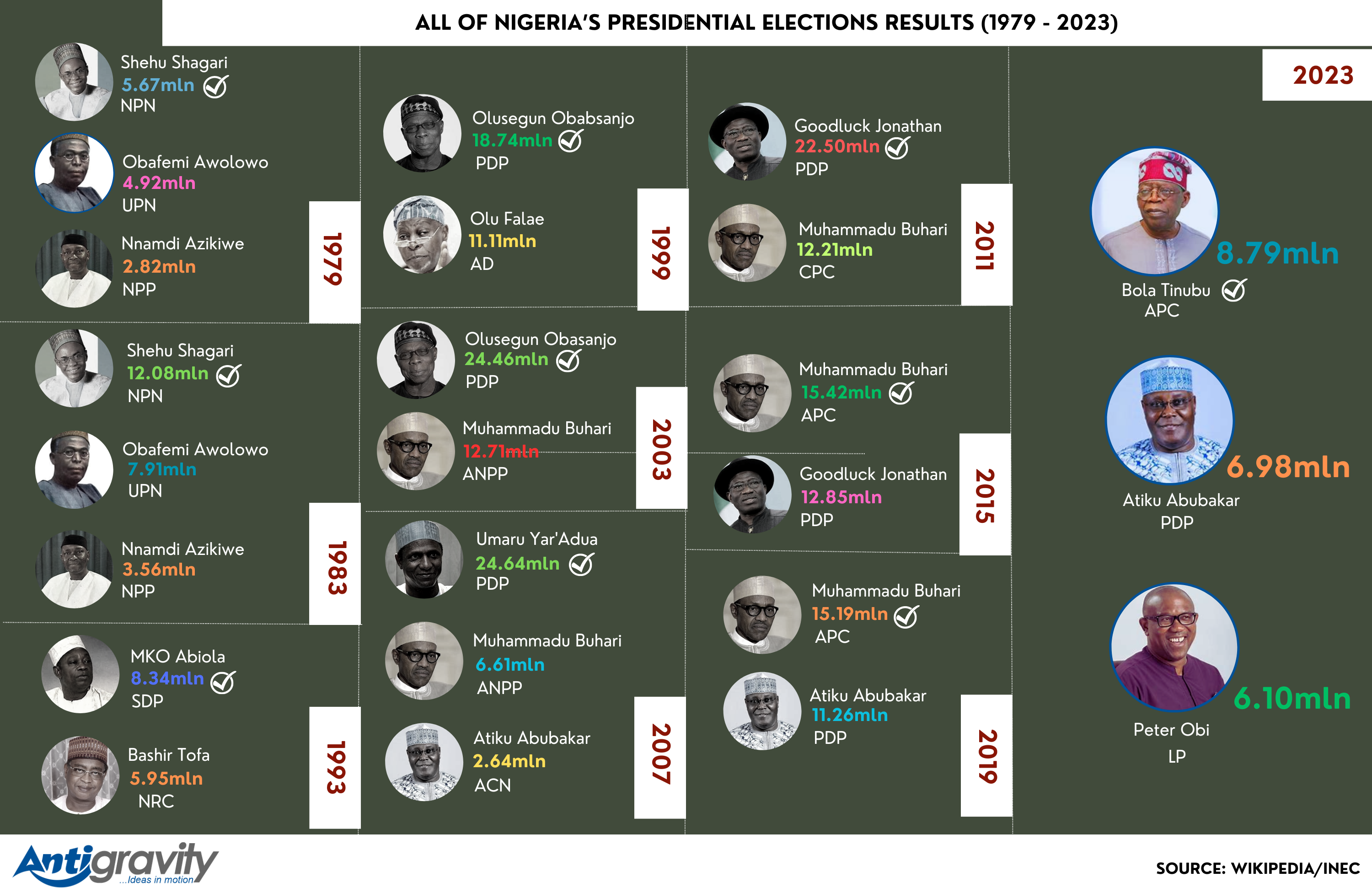 March 10th, 2023 | 03:39:AMFrom 1979 to the present day, Nigeria has undergone multiple changes in leadership through its presidential elections.